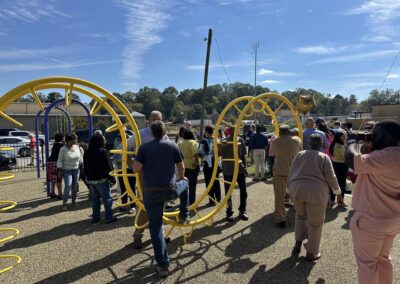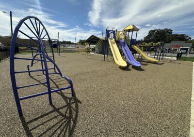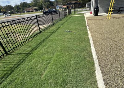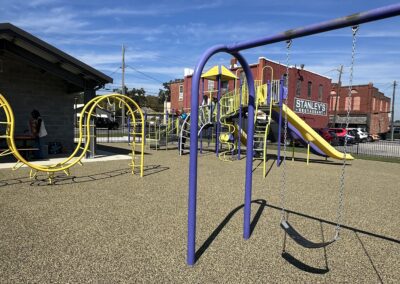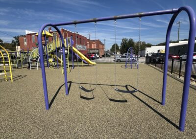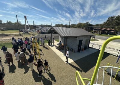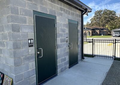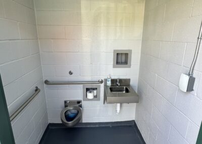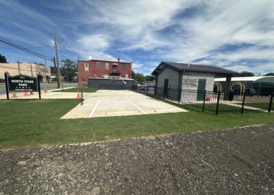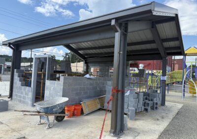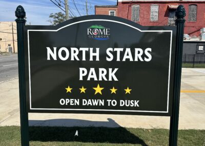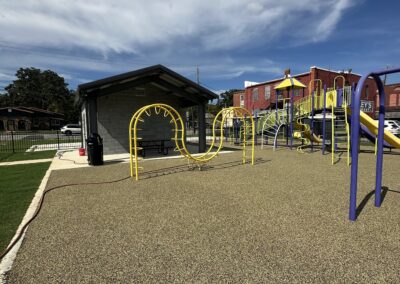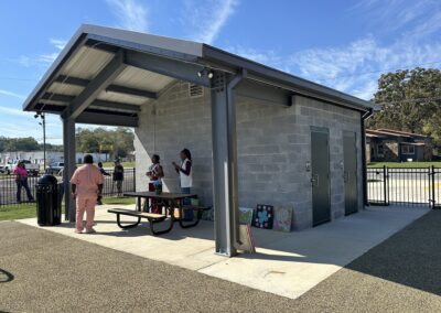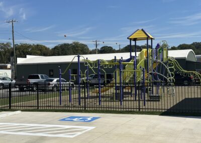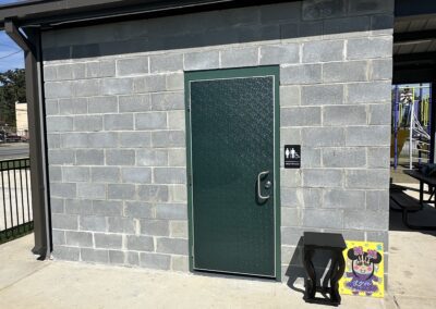 The North Stars Park building features three restrooms and a covered pavilion for the people of Rome to enjoy while they use the playground. After the metal frame and roof panels were set in place, the block work began. Simultaneously, playground footings were dug and the new equipment was installed. The final touch was the bonded-rubber mulch for the playground surface and the landscaping around the fence line.