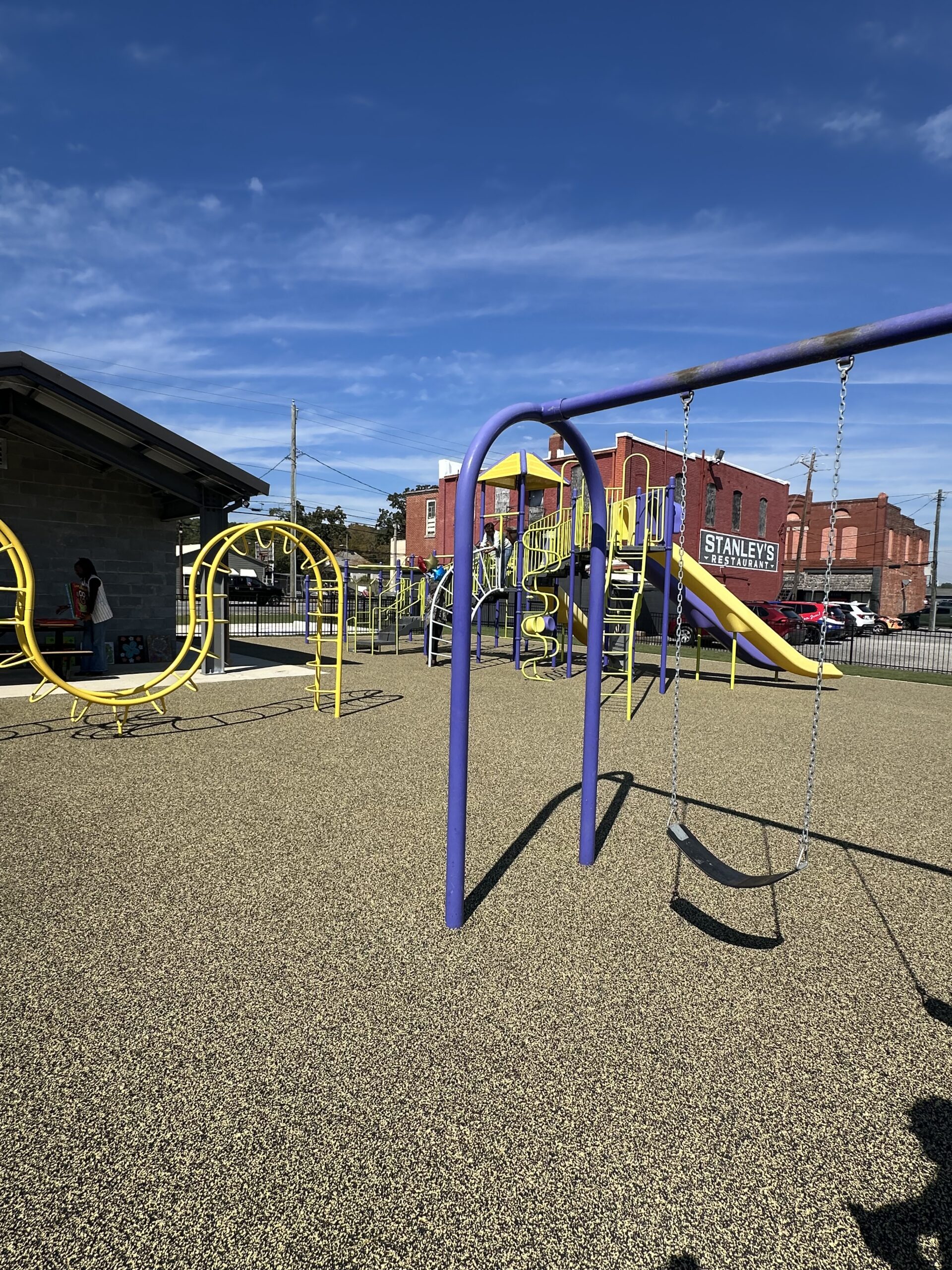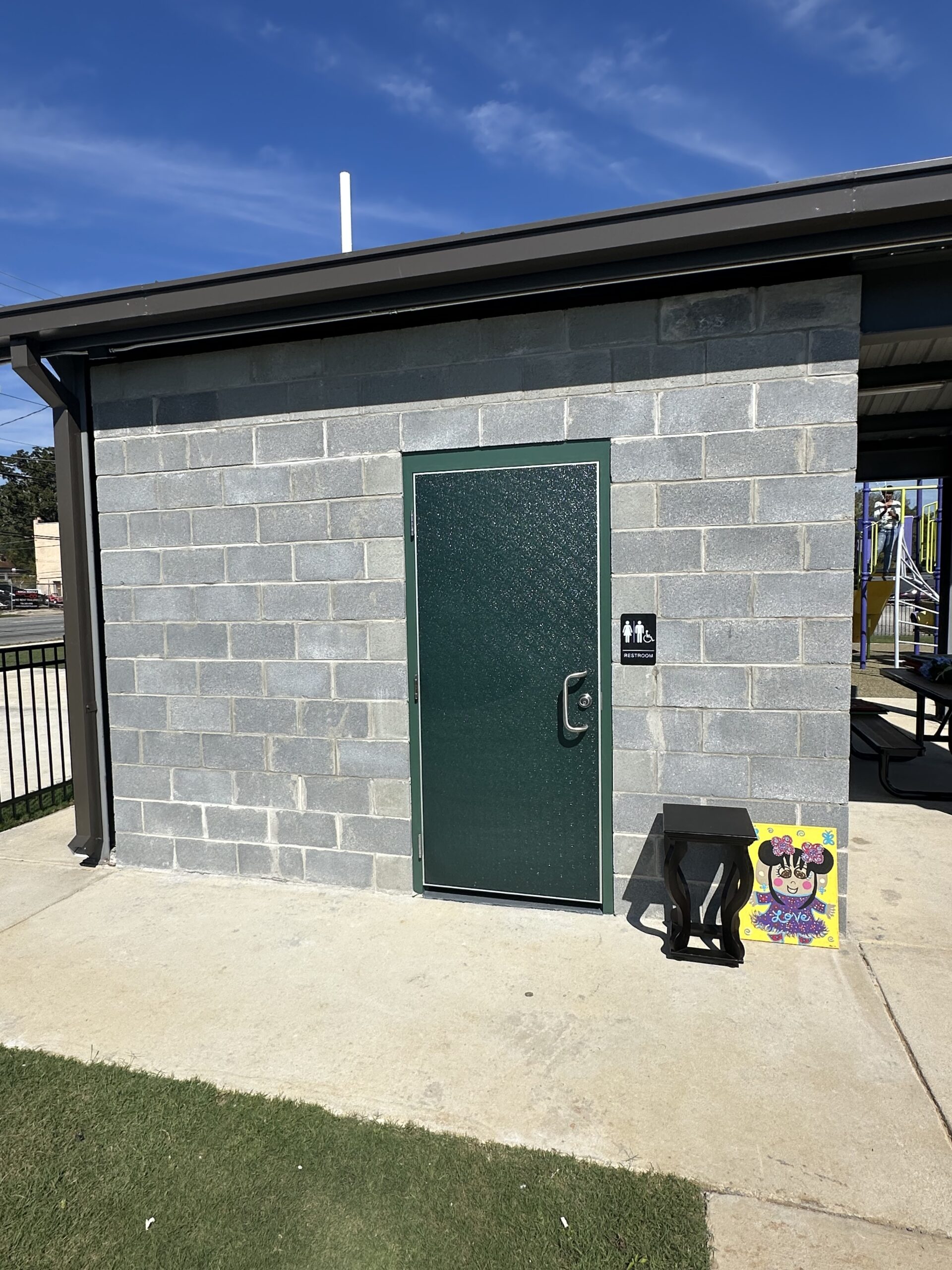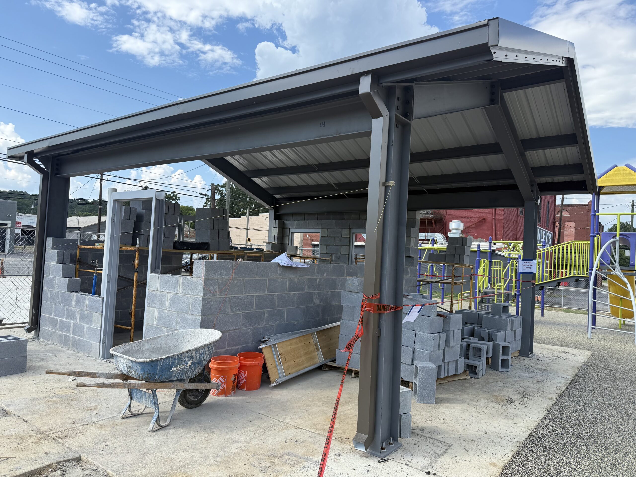 The North Stars Park building features three restrooms and a covered pavilion for the people of Rome to enjoy while they use the playground. After the metal frame and roof panels were set in place, the block work began. Simultaneously, playground footings were dug and the new equipment was installed. The final touch was the bonded-rubber mulch for the playground surface and the landscaping around the fence line.